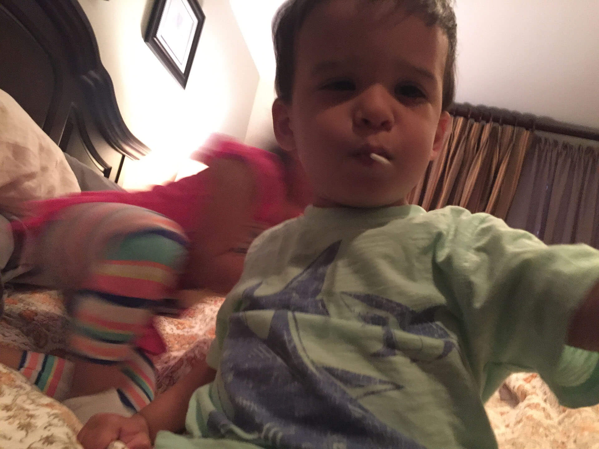 This is actually a pretty funny story. Daddy was at work and mommy text me the photos you see here. She started telling me that sh was laughing because of how funny the two of you are. Everyday you kids have routine with mommy. When mommy comes home you always go upstairs with her so that she can change. While you are upstairs in our room you guys jump on the bed, run around the room, etc , etc.