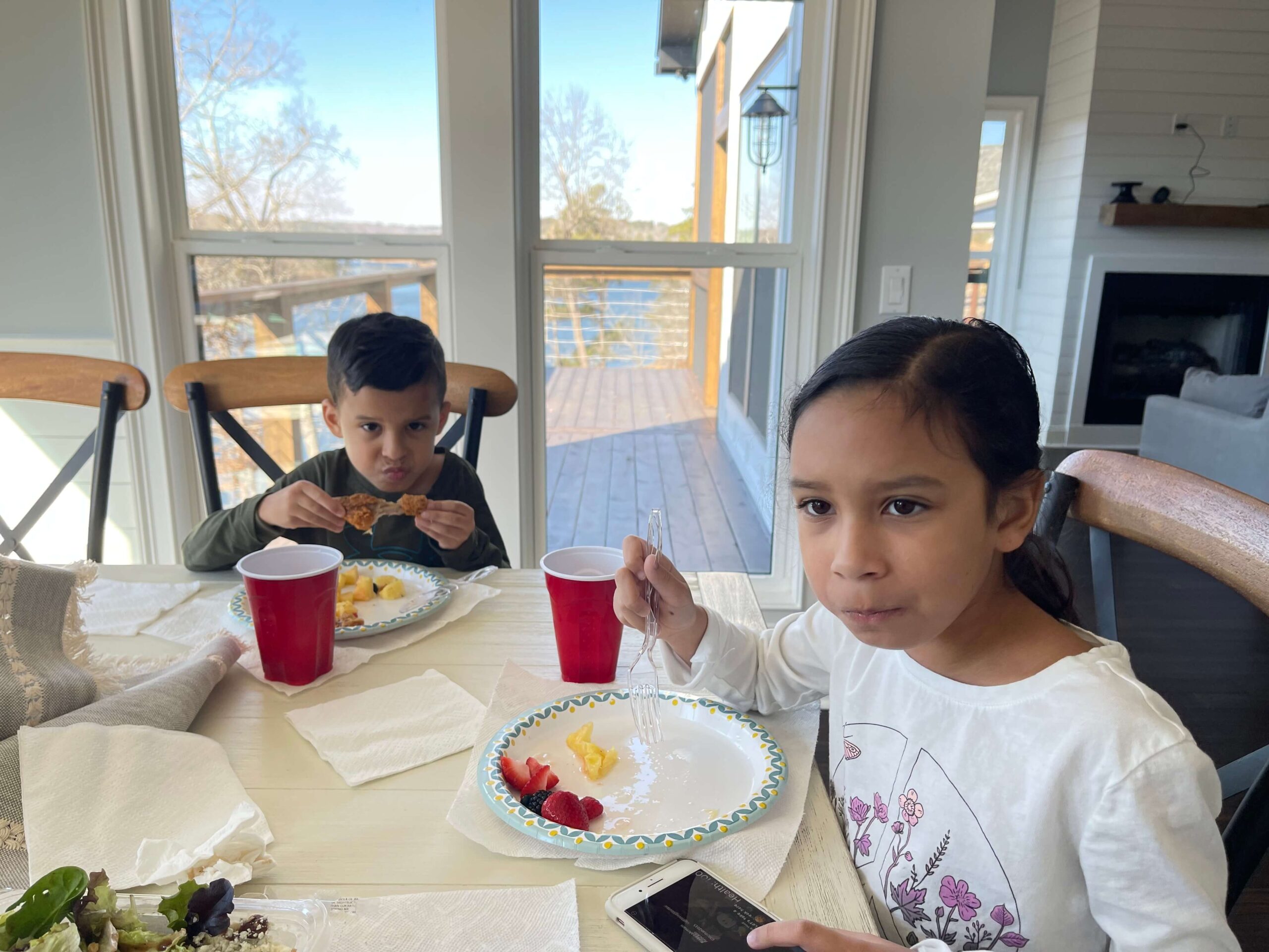 Came out to the lake house to deliver some furniture and we are having our first meal together as a family at our new lake house.