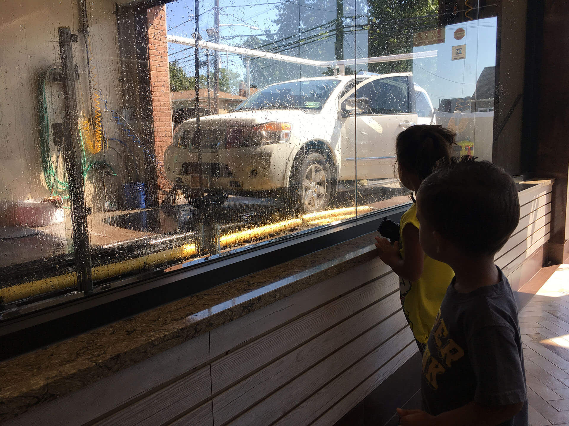 I remember as a little boy my dad used to take me to this old, run down car wash on the corner of Metropolitan Ave and Fresh Pond Rd. The picture is old as well but this is the updated one from when I was a teenager and I used to take my car here. I digress. I used to love going to the car wash and watching the car travel through a dark tunnel and come out clean. These days every thing is made out of glass and you can follow your car as its gets washed through every station. The both of you were very intrigued by the whole thing to say the least.