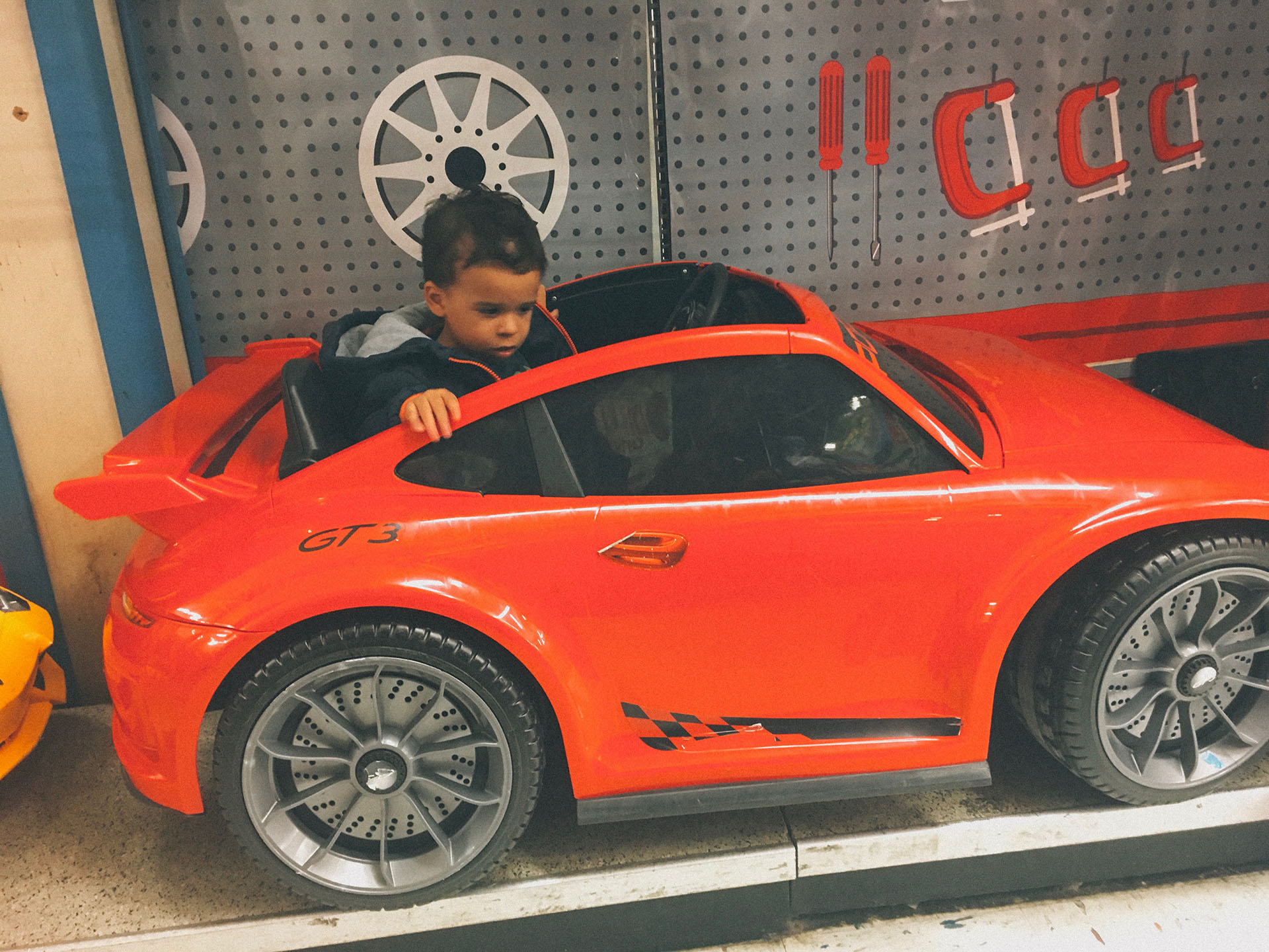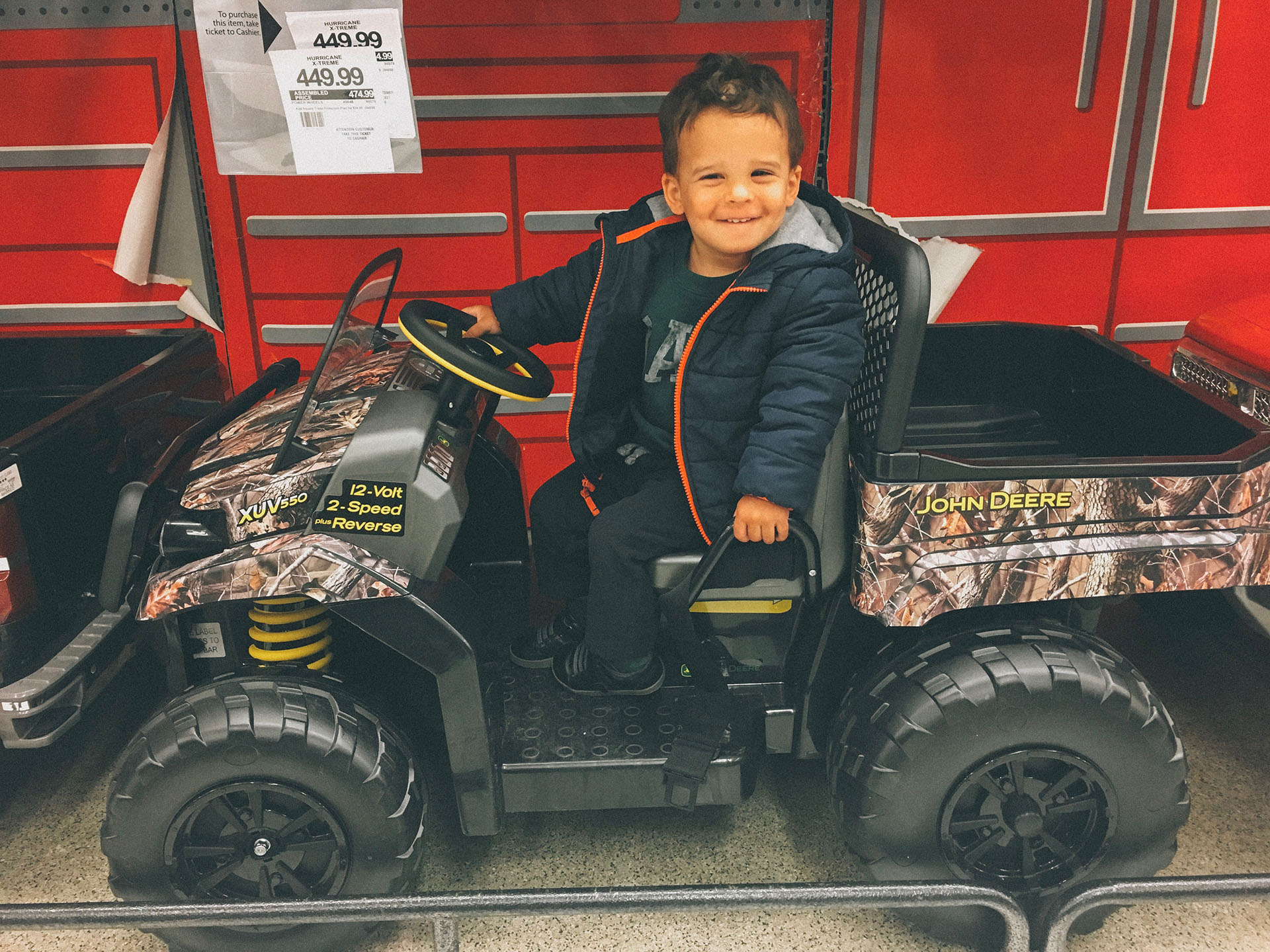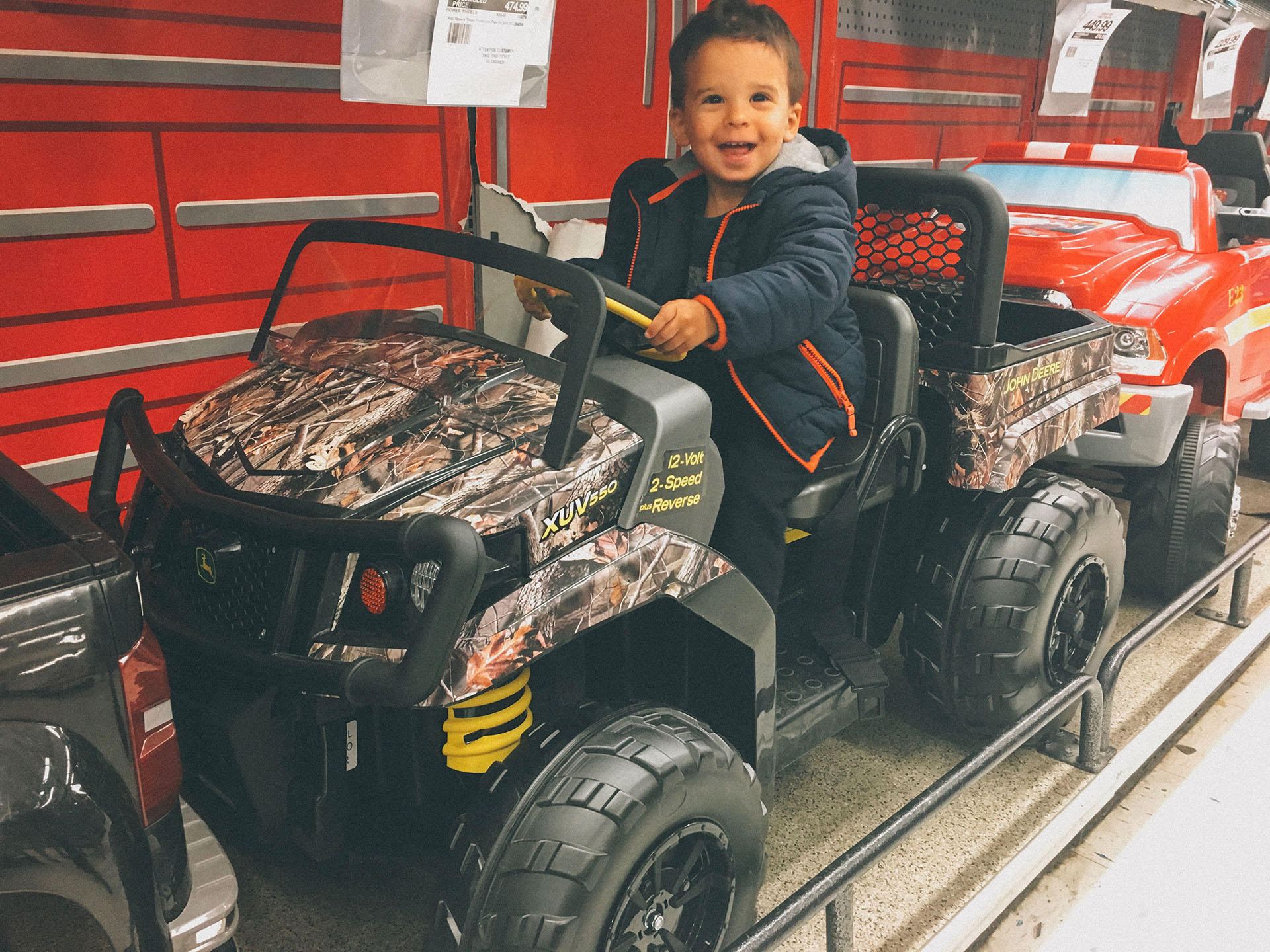 Its the day before Easter and Uncle Nick and Aunt Viviana invited us for Easter Dinner tomorrow. We went to Toy R Us to get some gifts for Chaucer and Alyssa. After picking out gifts for them we walked around the store and here we are at the “ride-on” section where Tyler lost his mind. He was trying out all the trucks and cars and then found his favorite two. I guess I know what mommy and daddy are getting Tyler for the summer.